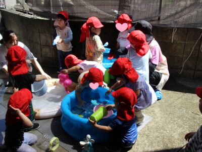 ぱぷりか保育園 平塚です。 水遊びを始めて1か月経ち、遊びが発展してきた様子をお伝えします。