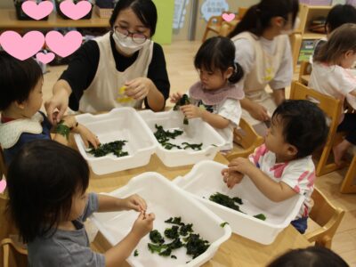 今日は。ぱぷりか保育園上大岡です。今回は、わかめの感触遊びをした様子をお伝えいたします。