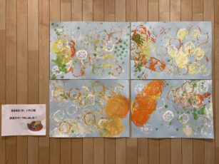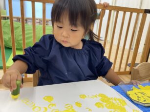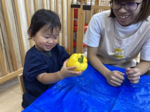 8月7日(木) ぱぷりか保育園 戸塚 キュウリ、なす、トマト、とうもろこしなど旬の夏野菜が美味しい季節ですね。れんこんやパプリカ、オクラで野菜スタンプをしました。うちわ製作で使用します。お楽しみに! 素敵な作品ができました。