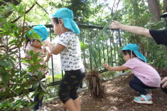 でも、、たまに蝉の抜け殻が保育者の頭にくっついてきちゃうのです^ – ^。