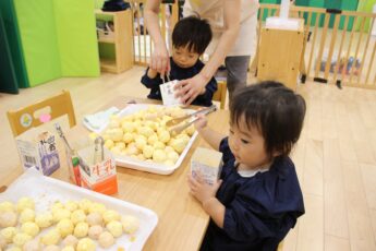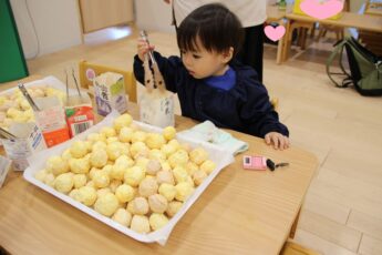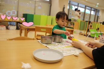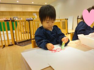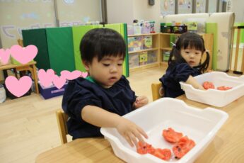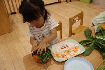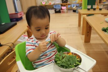 子どもたちに、ほうれん草を株から一本一本ばらしてもらい✌️、その他、人参の千切り、ナスの薄切り、豆腐と小麦粉のとろとろ粘土を使い、リアルおままごとをやってみました😊。彩を考えたり👍、粘土を食材に挟んだり✌️、粘土を上に塗ったり👌、「ママはこうしてた」と、お家の方がしている様子を思い浮かべながら💕、集中して食材と触れ合っていましたよ😍。