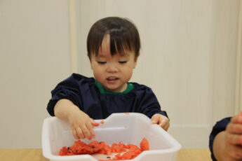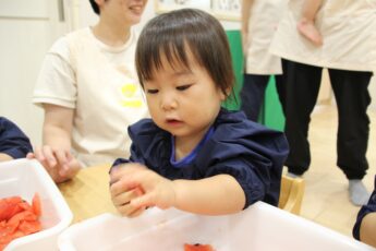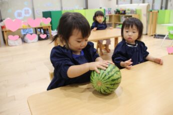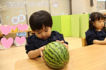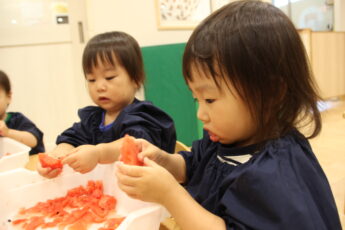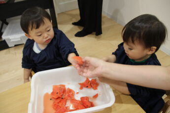 そのあとは、切り口をみんなで観察をして👍、さあ、種取に挑戦です😊。スイカの種は小さくてつるつるしていてつかみにくいので😂、種取にはなれている子どもたちですが😊💕、苦戦しているようでした。