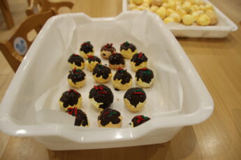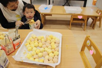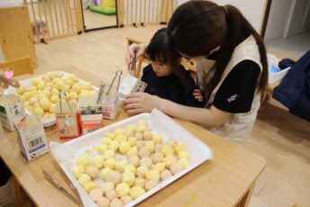 夏祭りの売り物で使うチョコバナナの仕上げをみんなにしてもらいました😍。小さなスプーンで好きなトッピングを上手にすくって👍😊、チョコバナナの上にパラパラしてもらいました💕。おいしそうなチョコバナナができましたよ😍👌。夏祭りへの期待が増しますね😊✌️。