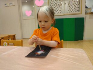 スクラッチ(ひっかき絵)も楽しみました😊✌️。カラフルなクレヨンを塗った下地の上に黒いクレヨンを塗り込んで作った、スクラッチシート💕をとんがった棒で引っかいて絵を描きました😊👍。引っかくだけで、きれいな色が沢山出てくるので😘、子ともたちはびっくりしていましたよ😍❤️💕。