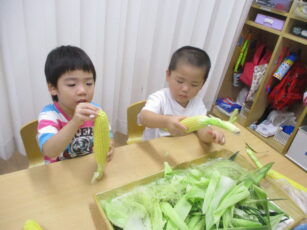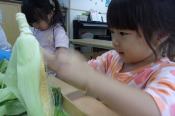 きりん組、ぱんだ組はとうもろこしの皮むき体験もしました🌽