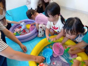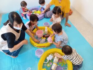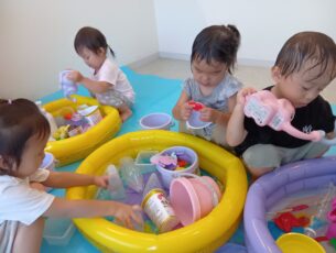 8月に入り、新しいカップや魚すくいなどの水遊びの玩具が増えて