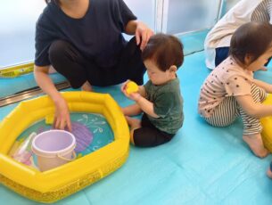 いちご組のお友だちは 、水をパシャパシャして顔にかかっても怖がらずに遊ぶようになりました。