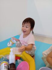 水遊びを始めて1か月経ち、遊びが発展してきた様子をお伝えします。
