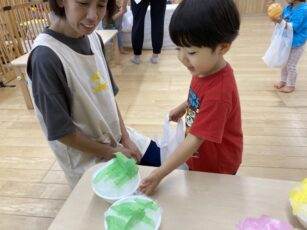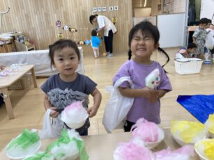 8月26日(火) ぱぷりか保育園 戸塚 夏祭りを行いました。おめんやヨーヨー風船、ボーリング、クラスで製作したものを見て回りました。「アンパンマン音頭」もとっても上手でした♡ またひとつ、夏の思い出ができました。 製作 いちご…わたあめ ぶどう…かき氷