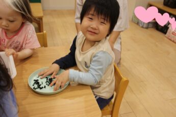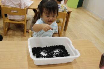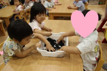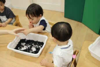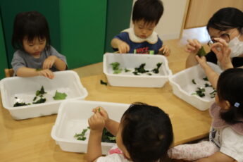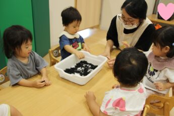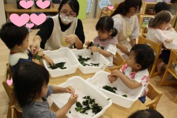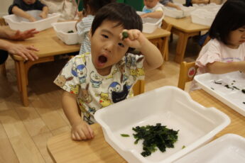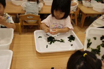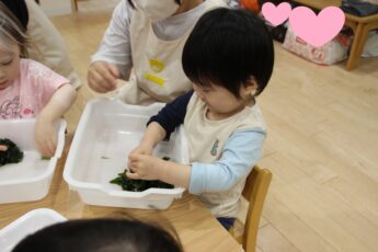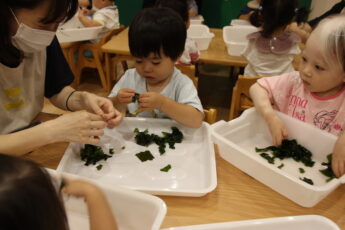 今日は。ぱぷりか保育園上大岡です。今回は、わかめの感触遊びをした様子をお伝えいたします。