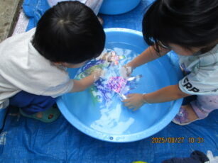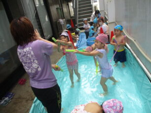 子どもたちのやってみたいを取り入れて、水遊びを楽しみました!