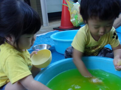 まずはペットボトルやカップの容器からどうやってシャボン玉が出てくるのかな?と皆で見たり触ったりして考えます。