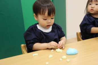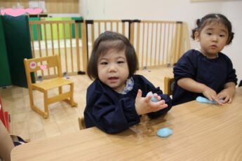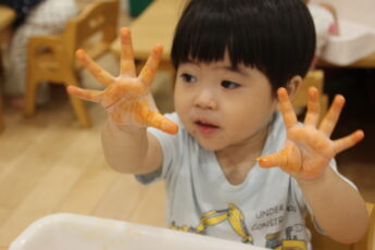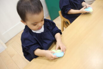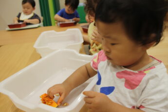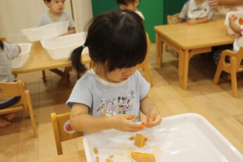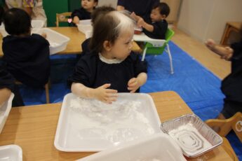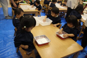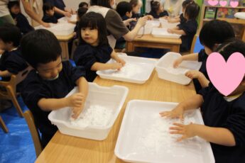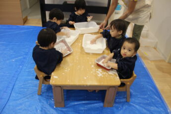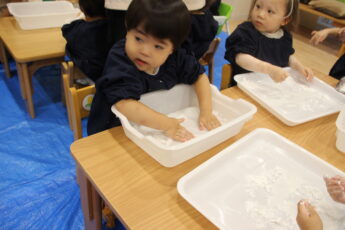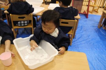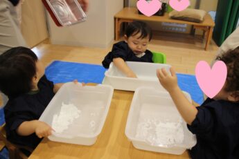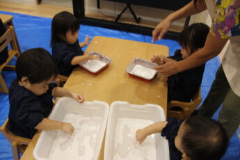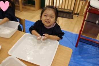 今日は何をするのかな😊?「今日は、かたくりこスライムで遊んでみたいと思います」「かたくりこスライム?😮‼️」みんなピンとこないようでした。はじめは水を入れないで片栗粉を粉の状態で触ってみました😊。