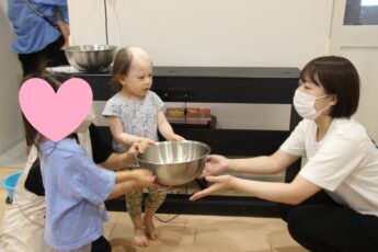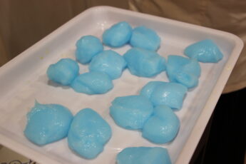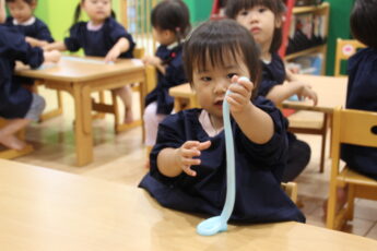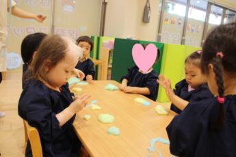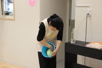クルン、バケツにくっつかなくなったらできあがりです。子どもたちは、スライム作りの実演にくぎ付けでした💕。