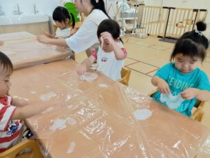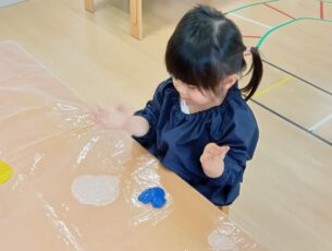 スライムを指で触ったり手の平で押してみたりと感触を楽しみつつ、押したところがへこんだり、潰すと平らになったりします。持ち上げると下に垂れて行ったり、何もしなくても広がっていく様子など形が変わっていくことも楽しみました。