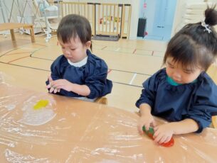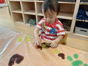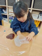 色の付いたスライムを受け取ると「同じなのかな?」と感触をたしかめたり、色を混ぜてだんだんと違う色を作ってみたりと楽しみ方をしました