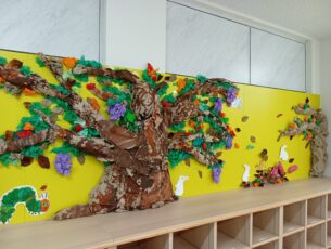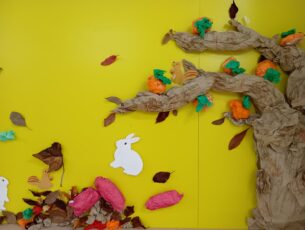 完成した壁面には、子どもたちの表情と同じくらい生き生きとした秋の風景が広がっています。