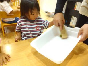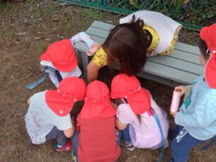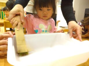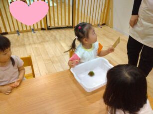 ★帰りの会で、先生が休日に出かけた群馬の温泉道で拾ってきてくれた野生のいが栗をみんなで触ってみました😊。素手で触ると怪我をするので💧、段ポールで作ったへら越しに触ってみましたよ👍。