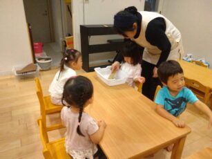 ぶどう組さんは、最近お当番活動を始めました😊💕。お当番さんがみんなのために、エプロンを配るお仕事をしています😊。ありがとうと言われてうれしそうなぶどう組のお当番さんです💕。
