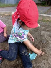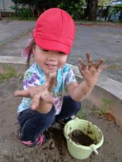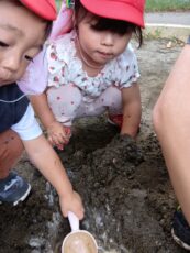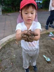 「おだんごできたよー」と自分で作った泥団子を見せてくれる子、「見て見てー」と沢山砂が付いた手を見せてくれる子、泥遊びが始まりました。