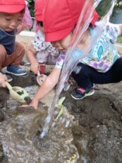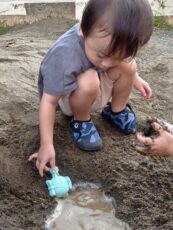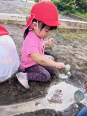 「わーい、お水だ」と喜んで手やシャベルを入れてみたり、手を砂に埋めてみたりと思い思いの遊びを展開しています。手を埋めて泥の感触を味わう子や手が汚れないように慎重に玩具を持つ子、すくった水の流れを楽しむ子とその子の個性が遊びの中に出ています。