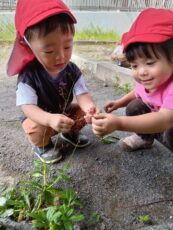 泥遊びが終わった後はお花を見たり、木を触ったりと子ども達が思い思いの遊びをして過ごしました。