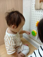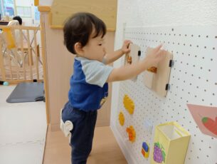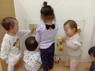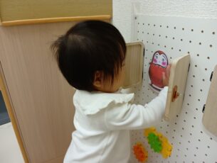 朝、登園してきて壁にボードがあることに気付くと、興味津々で触りにいっていた子どもたち!