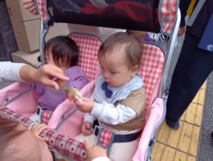緊張しながらもお菓子やハンカチをもらい嬉しそうな子ども達です。