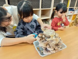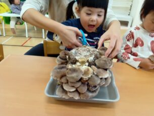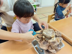 保育者と一緒にハサミを使って、キノコを収穫しました。