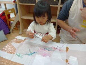 0歳児はお気に入りのシールで飾り付けます。
