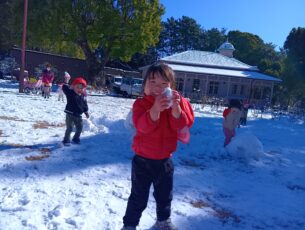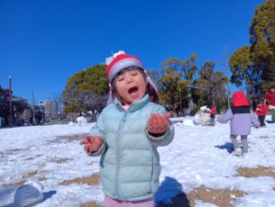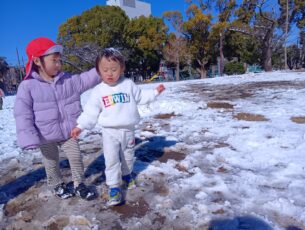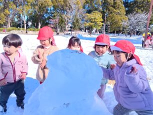 雪を見たことが初めてのお友だちも多く、なんだろう?と興味津々。早速雪遊びを始め、雪の上を歩いたり、触ったりして「わぁー」と声を上げながら雪の感触や冷たさを確認していました。