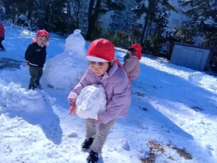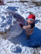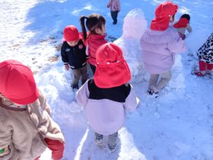 おおきな雪の塊を見つけてみんなで飾り付け、丸めた雪を付けてみたり、指で模様をつけたりしました。
