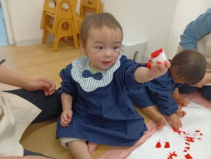 スポンジや絵の具の感触に興味を示すれもん組(0歳児クラス)の姿もありました。