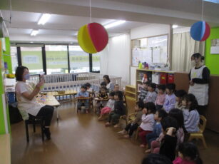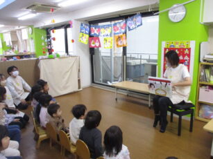 まずは「ひなまつりのごちそう」という紙芝居を先生に読んでもらいました