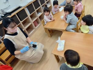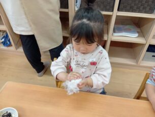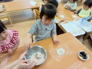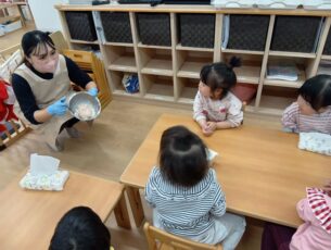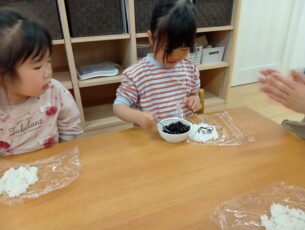 それぞれの年齢に合わせて2歳児は具材を自分でご飯の上に乗せるところから行い、とても上手に握っていました。