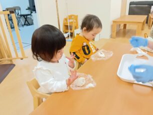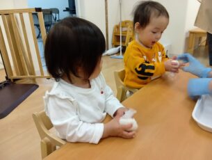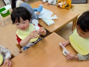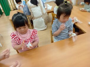 0歳児と1歳児はラップに包んであるご飯を「ぎゅっぎゅっ」と優しく握っています。