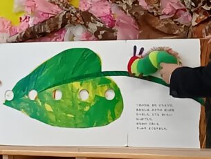 保育者からの絵本の読み聞かせが始まる頃には保護者の方もお子様も少しずつ緊張した雰囲気がほぐれて、大型絵本「はらぺこあおむし」を興味を持って見ていました。