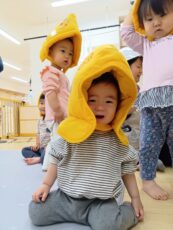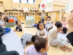 その後はいちご組さんも一緒に参加し、「ダンゴムシポーズ」を