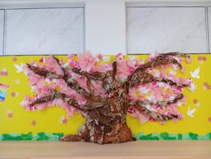 葉を表現するのに花紙、ビニール袋、折り紙を使いました。