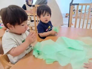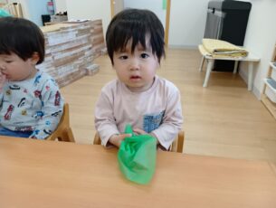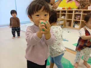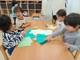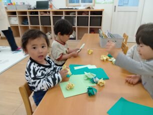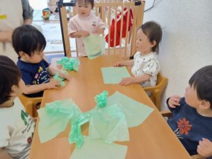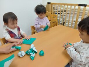 ぶどう組(2歳児クラス)は折り紙もくしゃっと丸めました。
