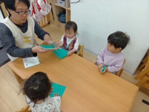 「はっぱ?」「これぺたぺたする?」と折り紙が葉になることに興味や楽しみが広がります。