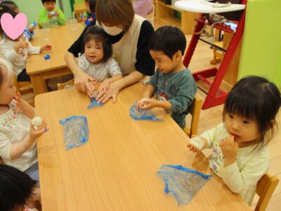 れもん組のお友だちも「これなんだろう?」と興味津々で触って感触を確かめたり、触りたがらない子も。